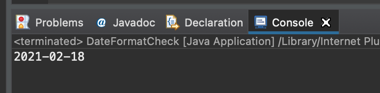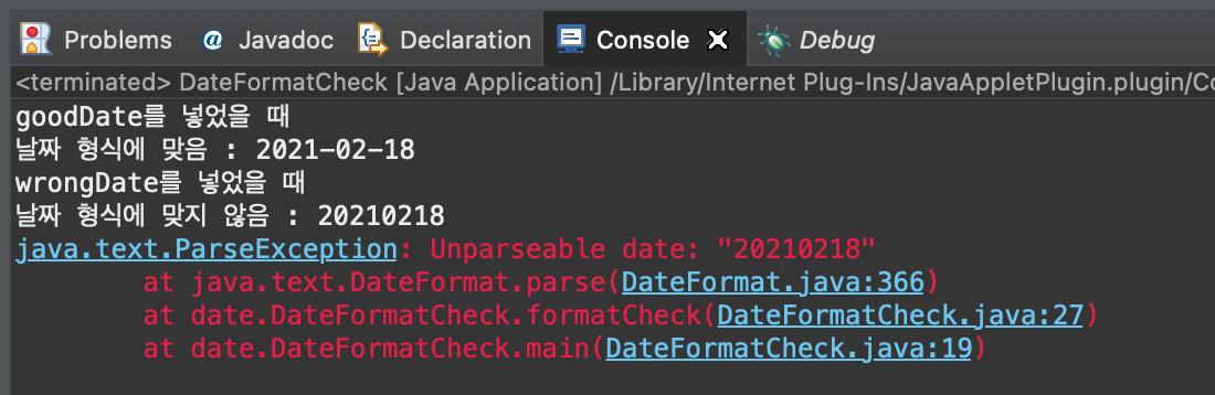 formatCheck(wrongDate)를 실행했을 땐 catch문에서 ParseException을 찍어주는 것을 확인할 수 있습니다.