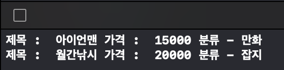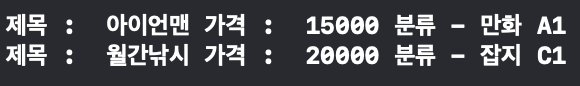 print("제목 : ", title, "가격 : ", price, "분류 - 잡지")