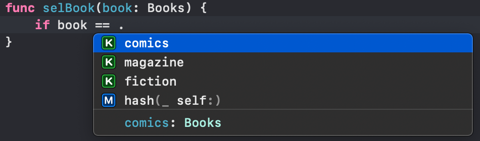 . 온점을 찍으면 자동으로 Books 타입 케이스들을 보여준다.