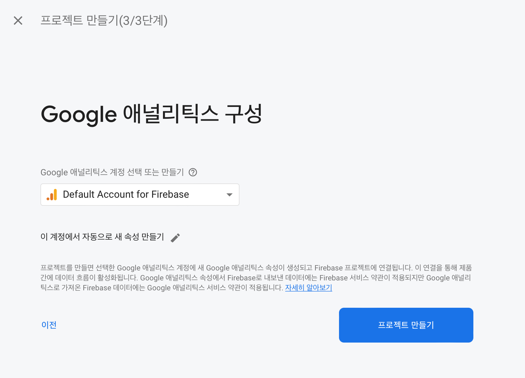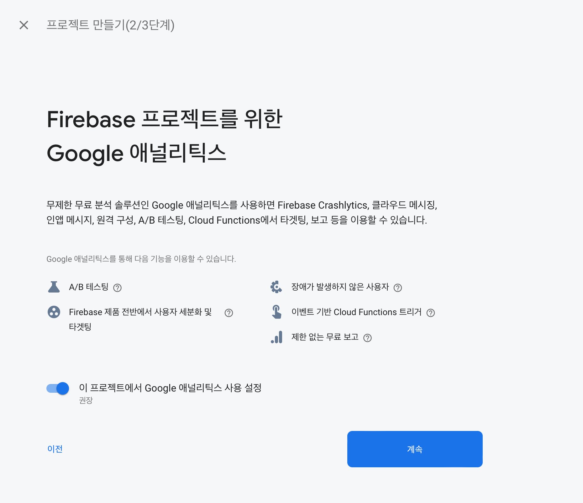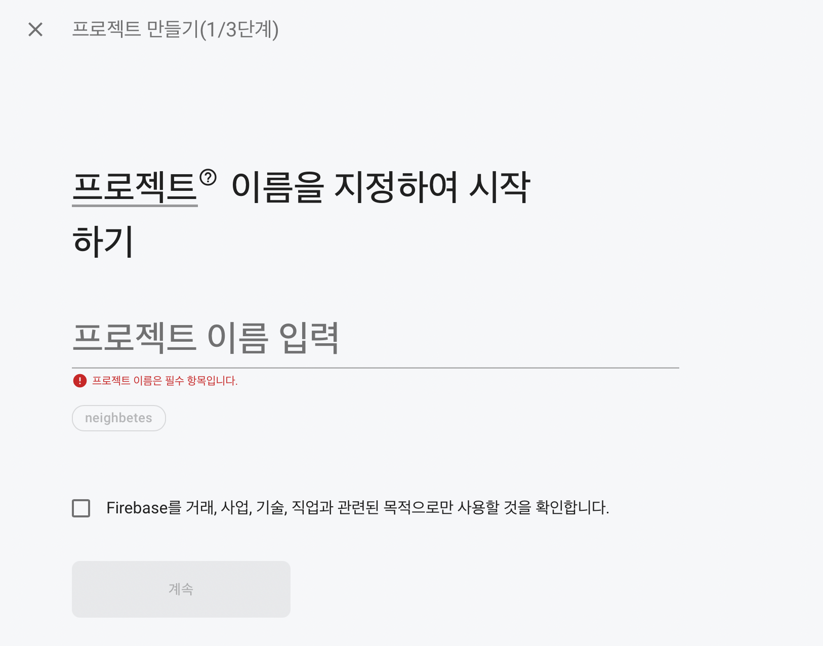프로젝트 이름을 입력하고 체크박스에 체크 -> 계속