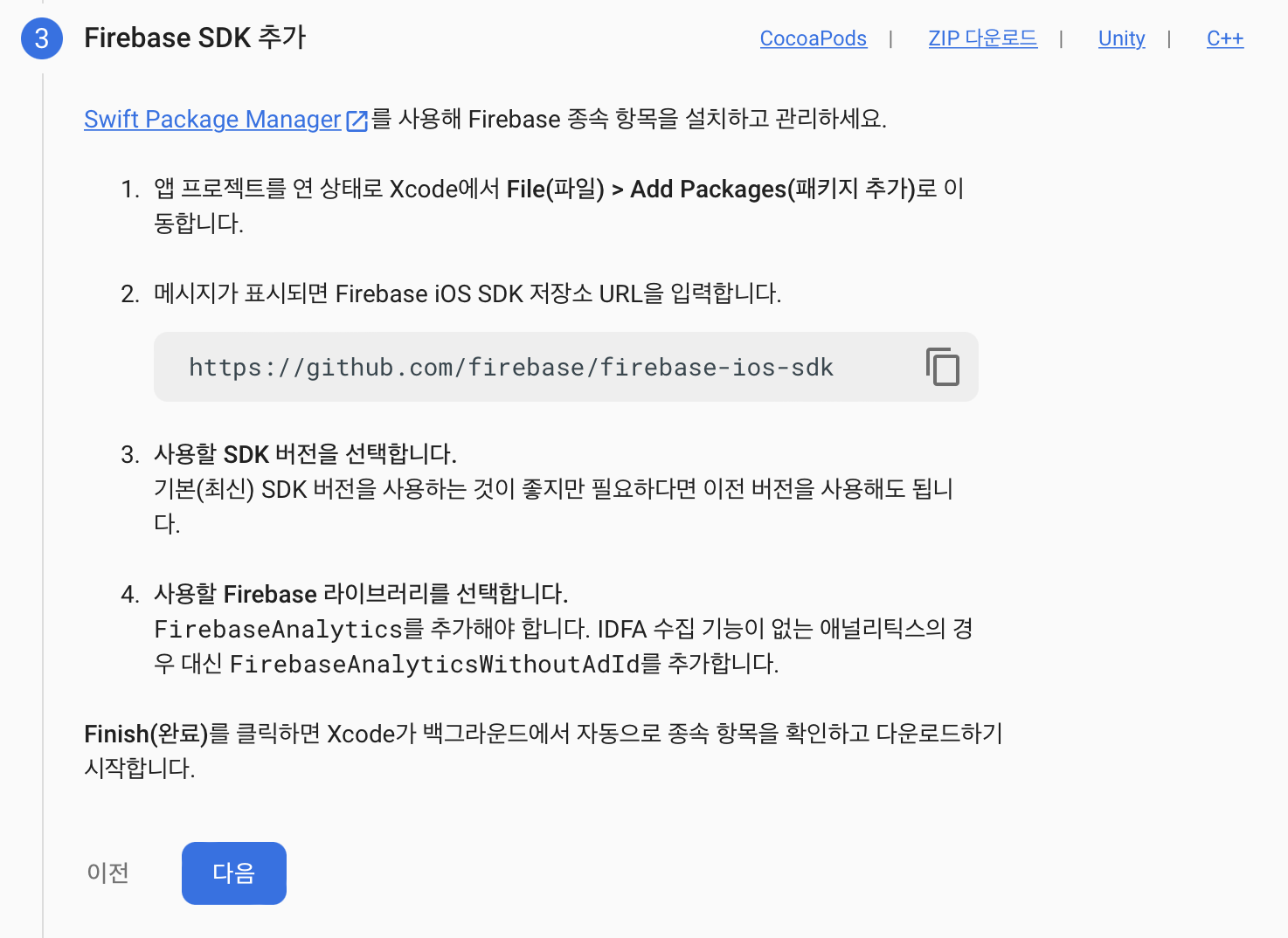 Firebase가 알려준 방법대로 Xcode File -> Add Packages -> URL을 검색 -> Add Package -> FirebaseAnalytice 체크 Add Package