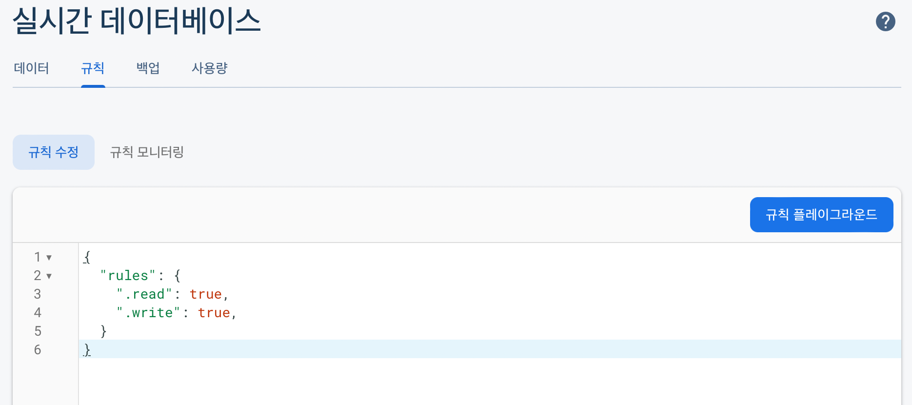 Realtime Database를 생성하고 규칙을 읽기 / 쓰기 모두 true로 해준다.